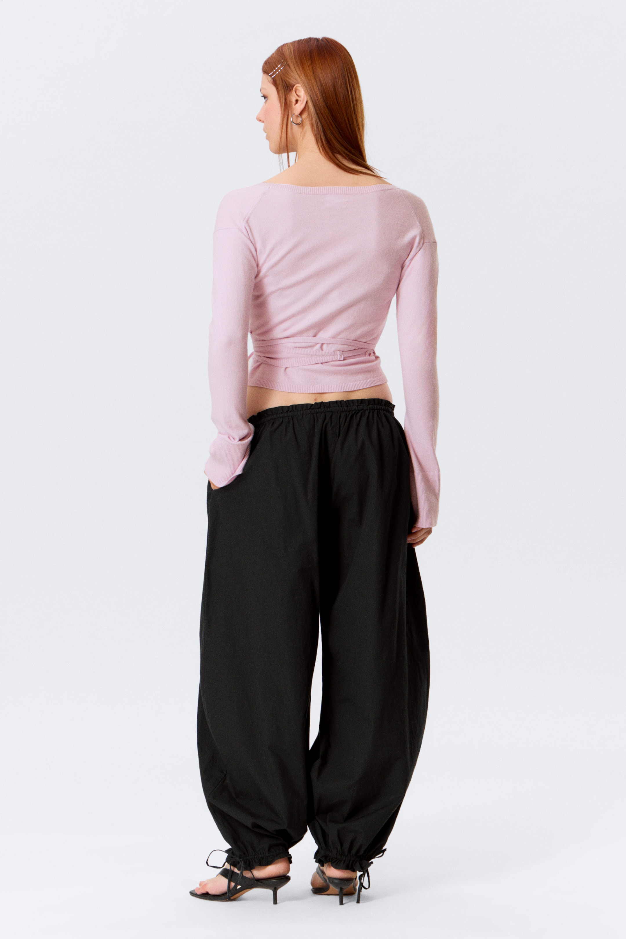 En strikket cardigan med vanlig passform laget av et mykt, lett garn med glatt følelse. Har dyp V-hals og omslagsfront som knytes i siden for justerbar, figurnær passform. Lange ermer og kort lengde.