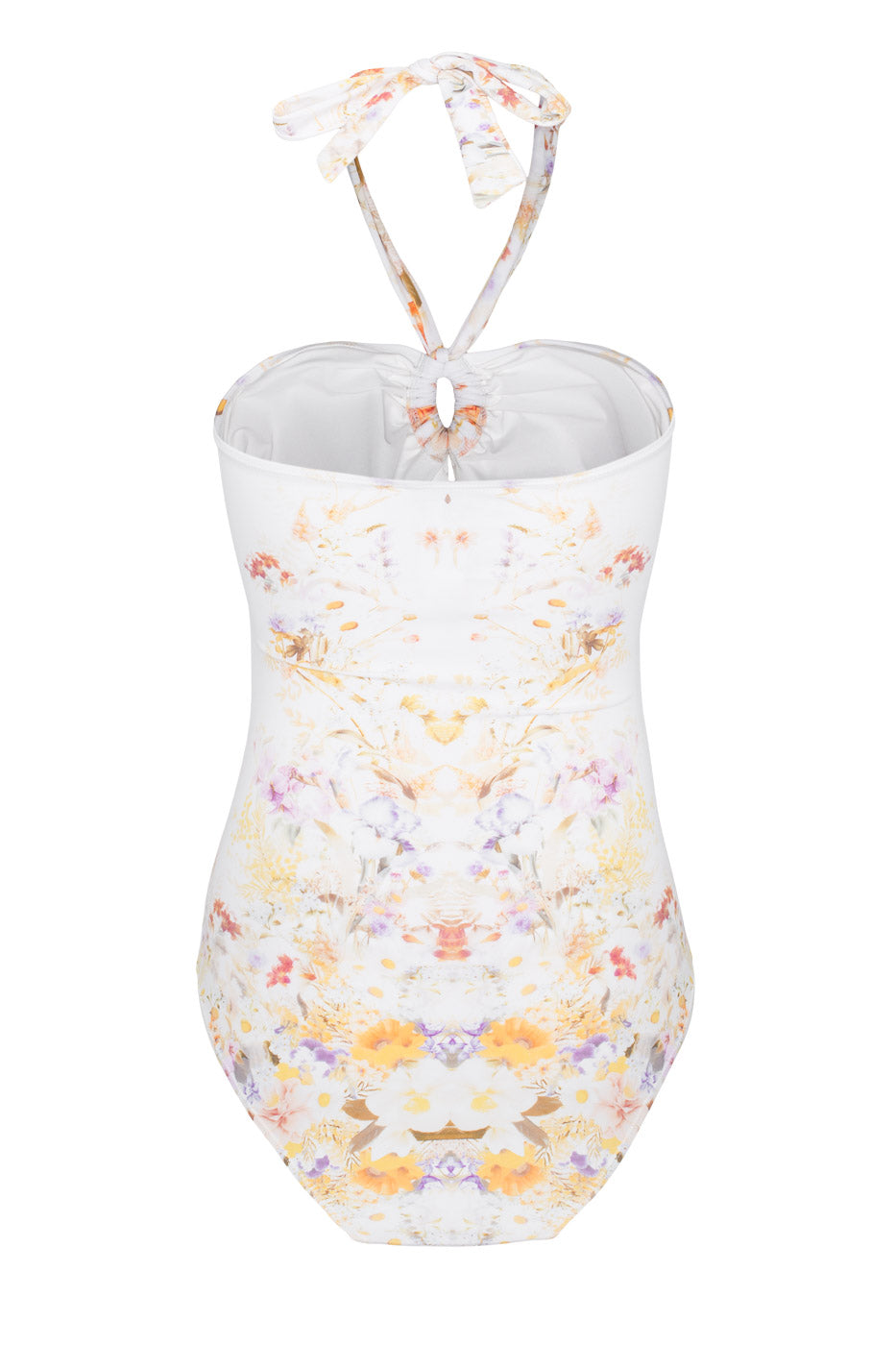 En feminin og flatterende badedrakt, med en myk hvit base og et delikat, blomsterprint inspirert av en hage. Designet med bandeau-inspirert overdel og halterneck-knyting, samt elegante rynkedetaljer og en subtil cut-out i front som fremhever silhuetten og gir lett støtte.