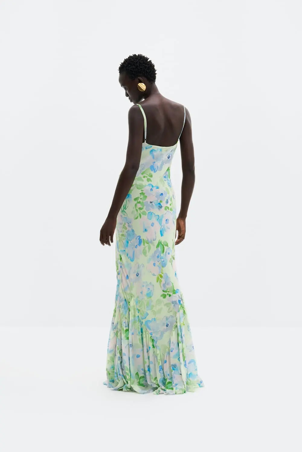 Maxi slipkjole i silkeblanding med mykt drapert utringning og lett, bølgende fald som gir et elegant og feminint uttrykk. Kjolen har justerbare stropper og en figurnær passform over bryst, midje og hofter for en flatterende silhuett.