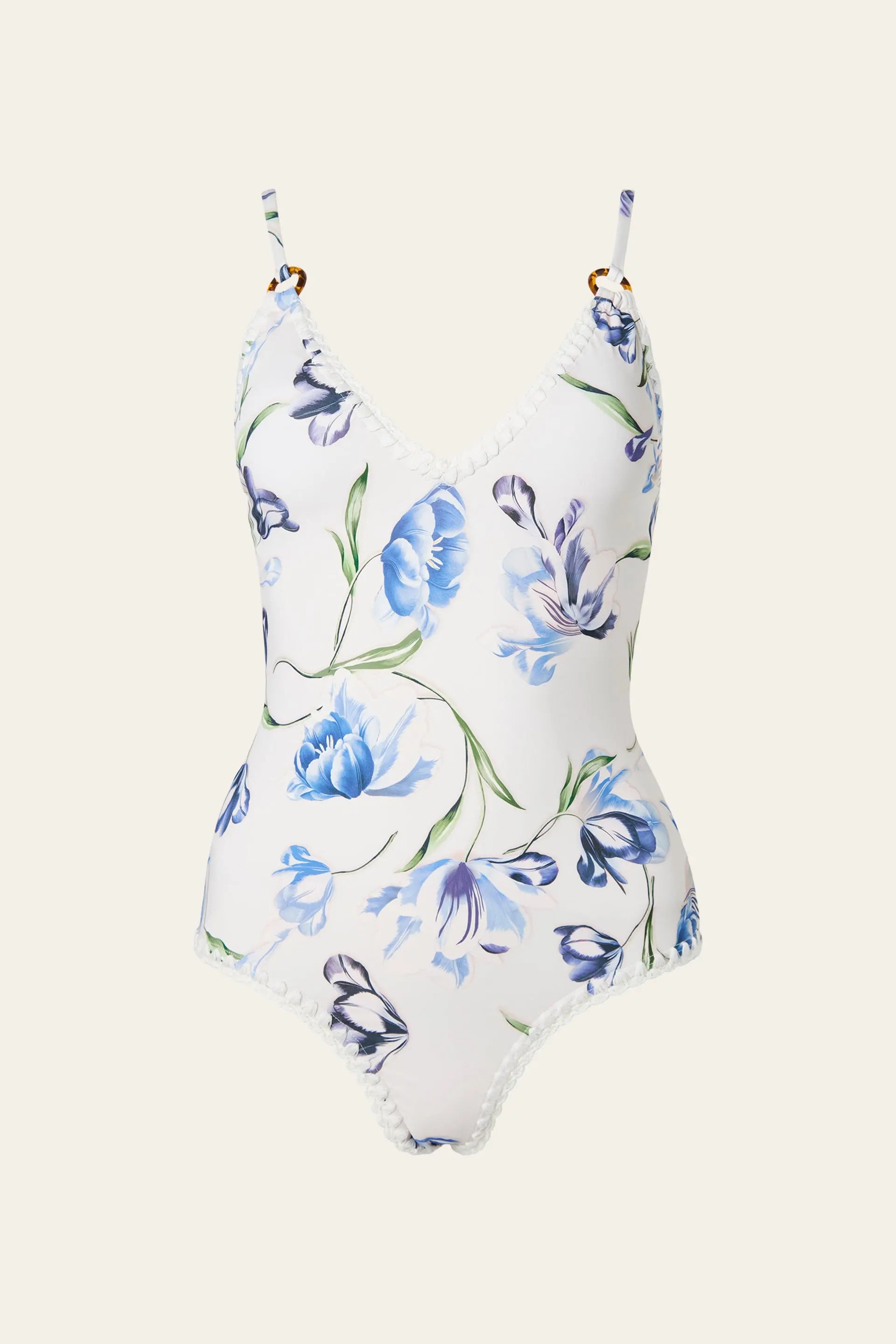 Badedrakt med V-utringning, heklede detaljer og dekorative ringer. Modellen har justerbare stropper og uttakbare innlegg for tilpasset støtte og komfort. Badedrakten har et blomstermønster med tulipaner i blåtoner på hvit bakgrunn.