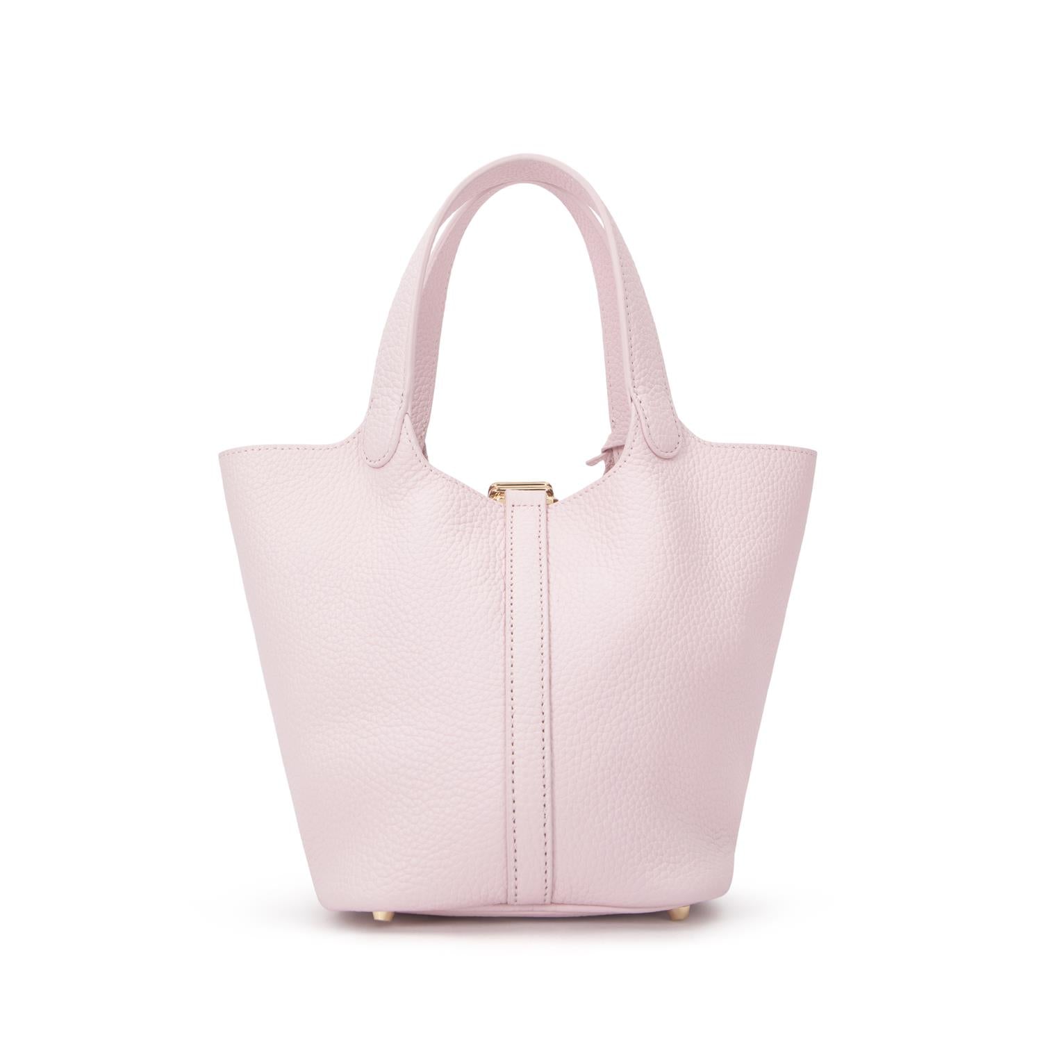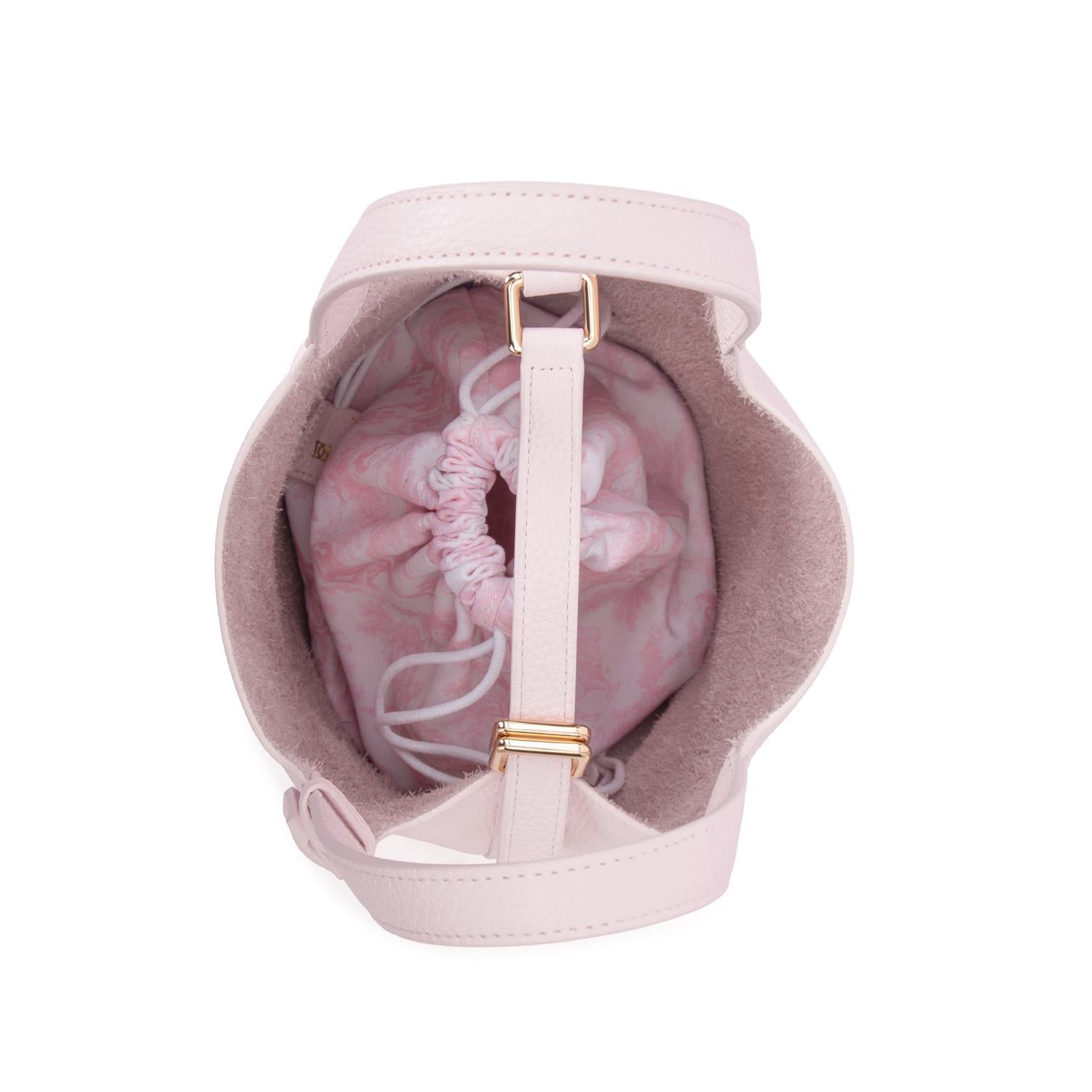 Liten bøtteveske i lys rosa preget skinn med gulldetaljer. Vesken har en strukturert fasong, topphåndtak og midtre stropp med dekorativ hengelås. Avtakbar innerpose med rosa marmormønster følger med. Beskyttende metallføtter i bunnen. Omtrentlig størrelse: 19 x 13 cm.