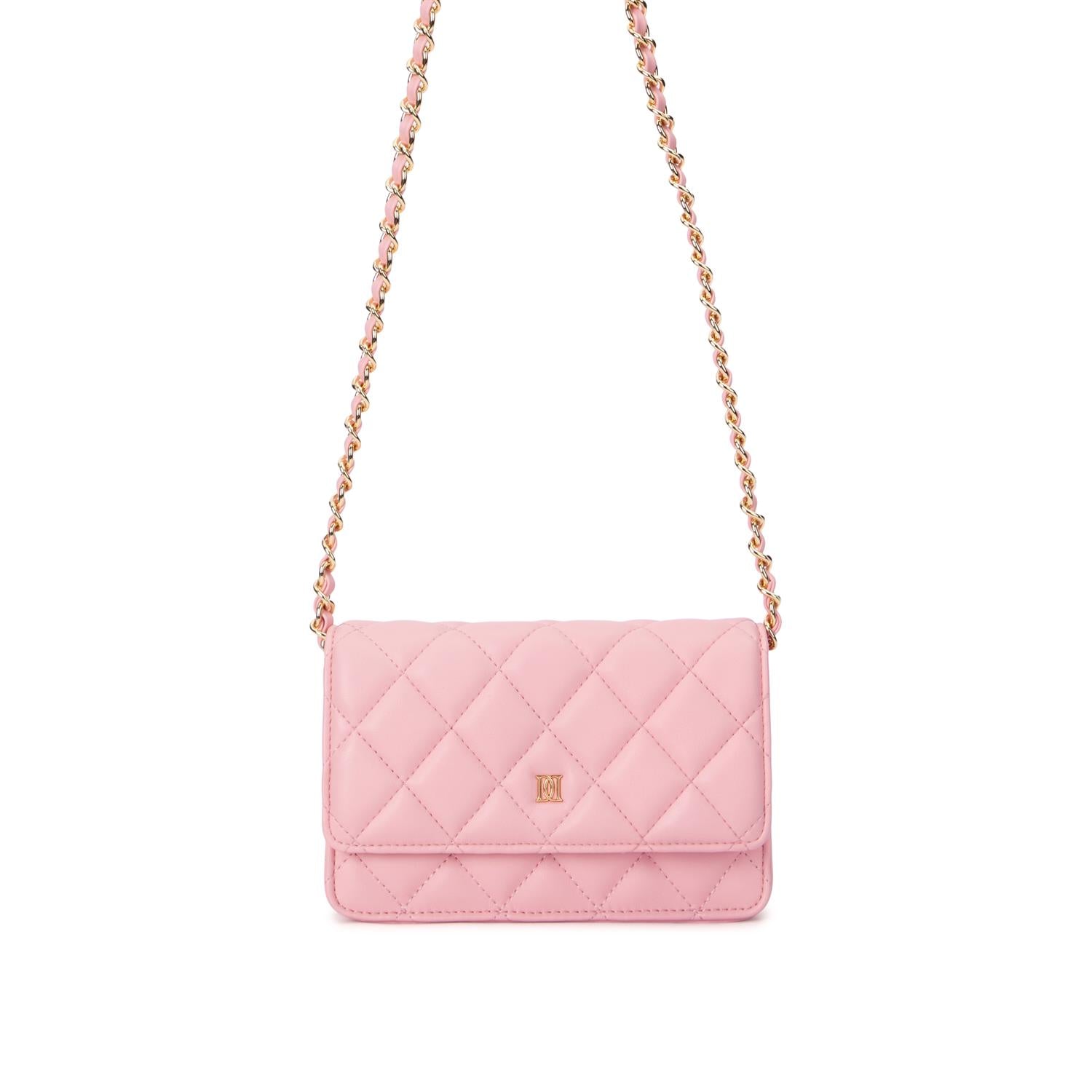 Liten veske i lys rosa med quiltet skinn. Har en gullfarget kjedestropp med matchende skinn og frontklaff med gullfarget logodetalj. Innvendig glidelåslomme for sikker oppbevaring. Kompakt størrelse, perfekt til det viktigste.
