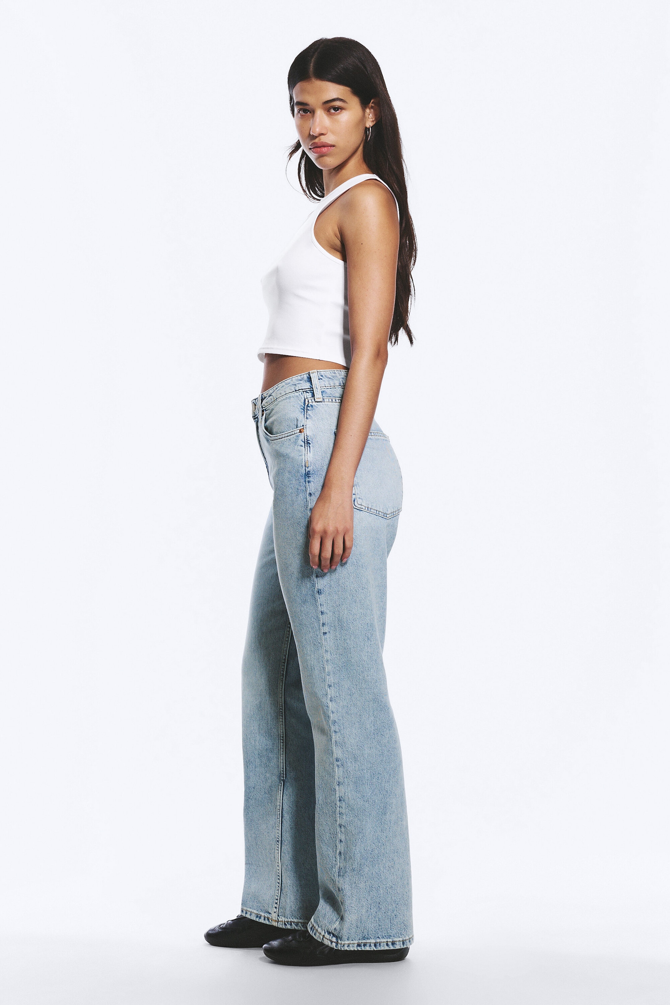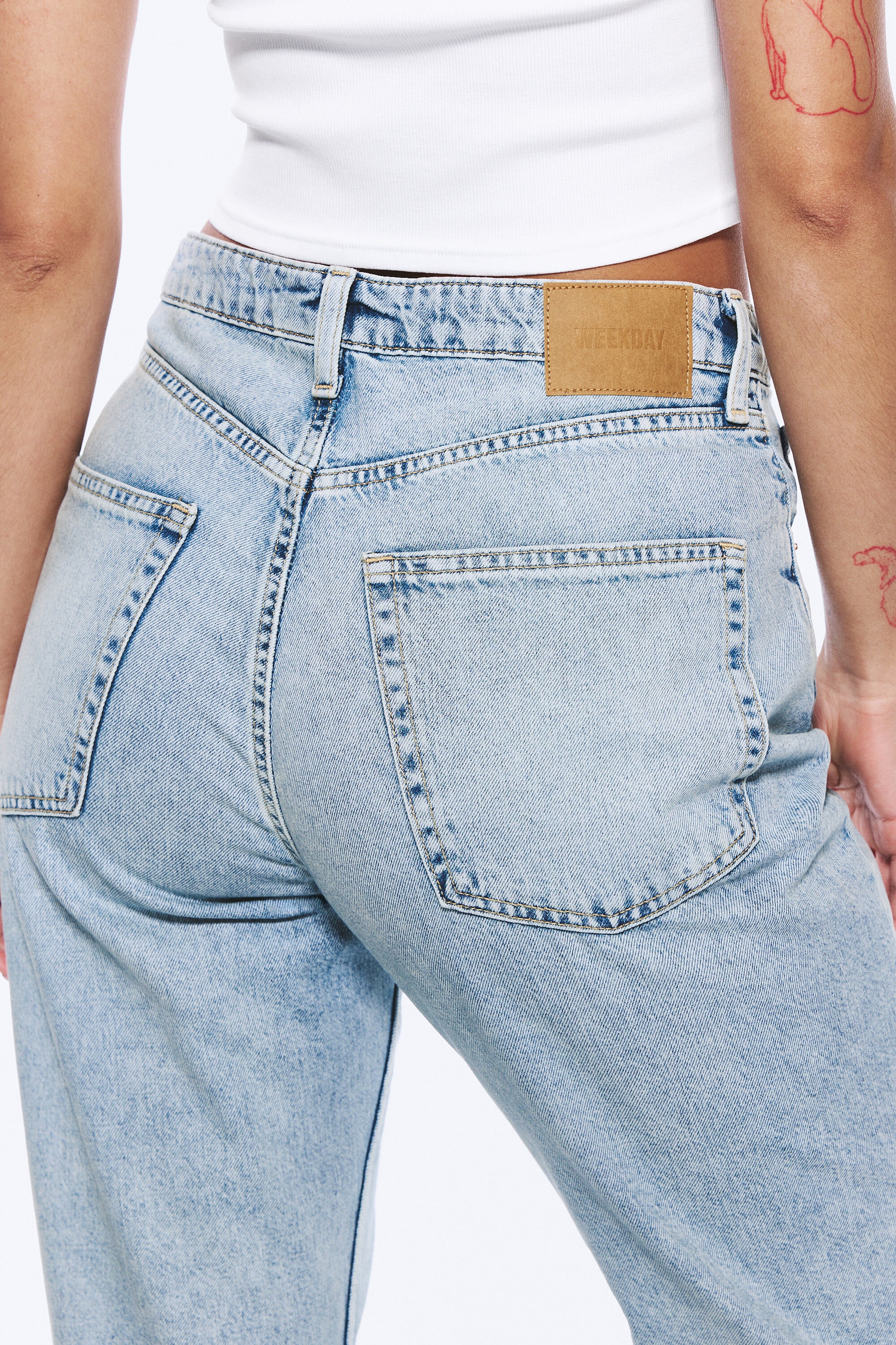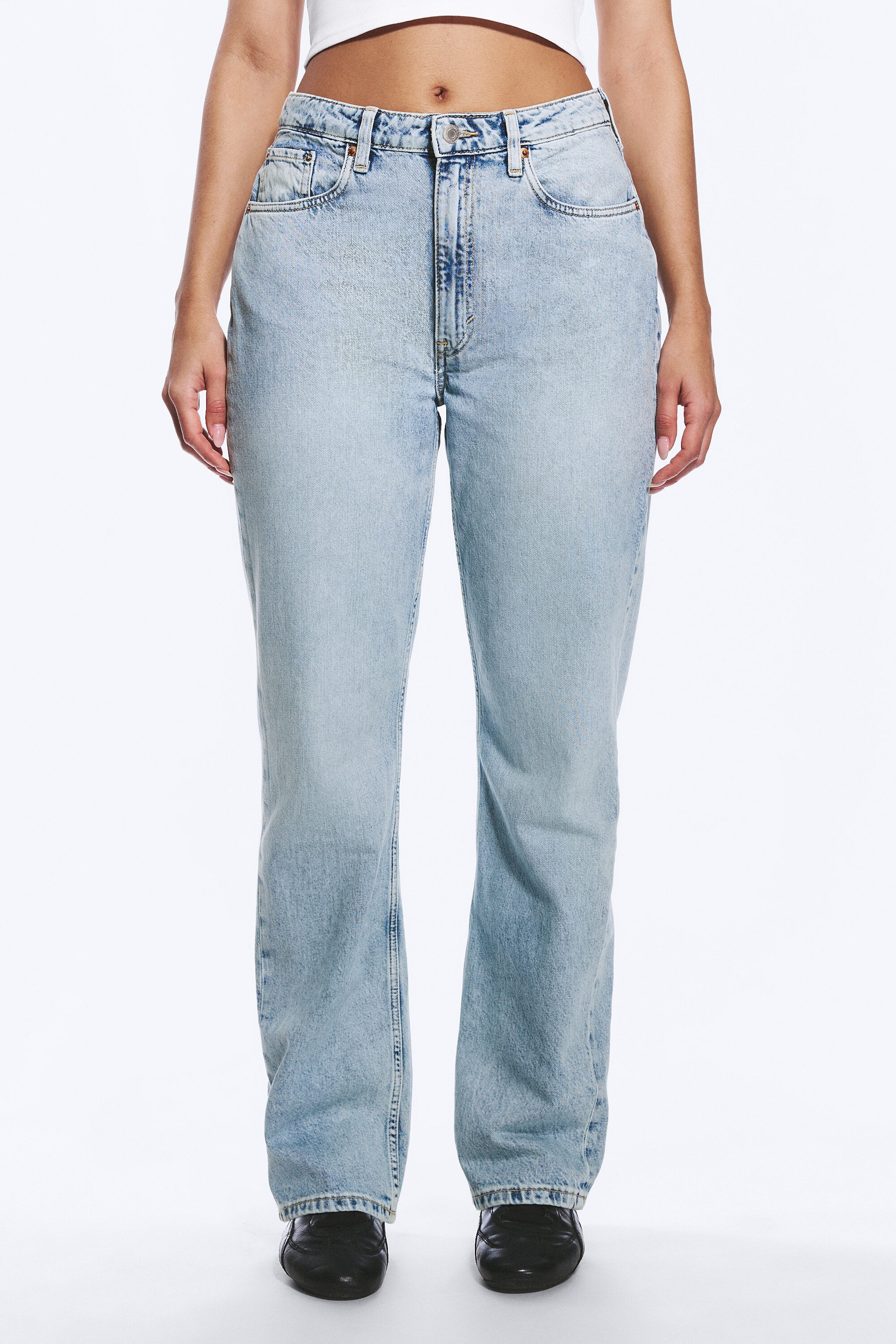 Et par high-waist jeans med vanlig passform og rette ben. Designet med timeglass-silhuett for å fremheve midje-hofte-forholdet og redusere glippe i midjen, med mer plass over hofte og lår. Laget av stiv denim i økologisk bomull med resirkulert bomull. Klassisk 5-lommers design og glidelåsgylf.