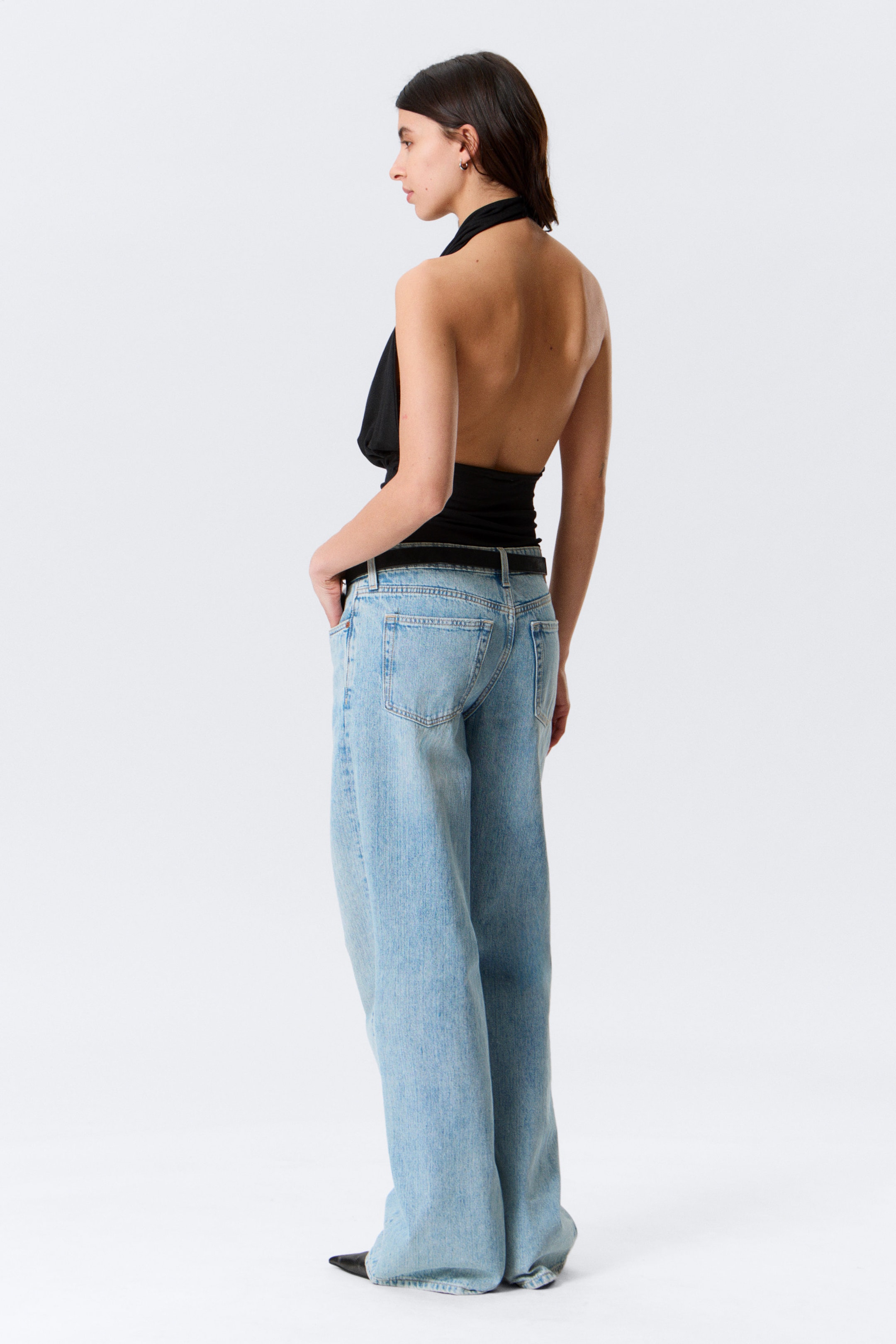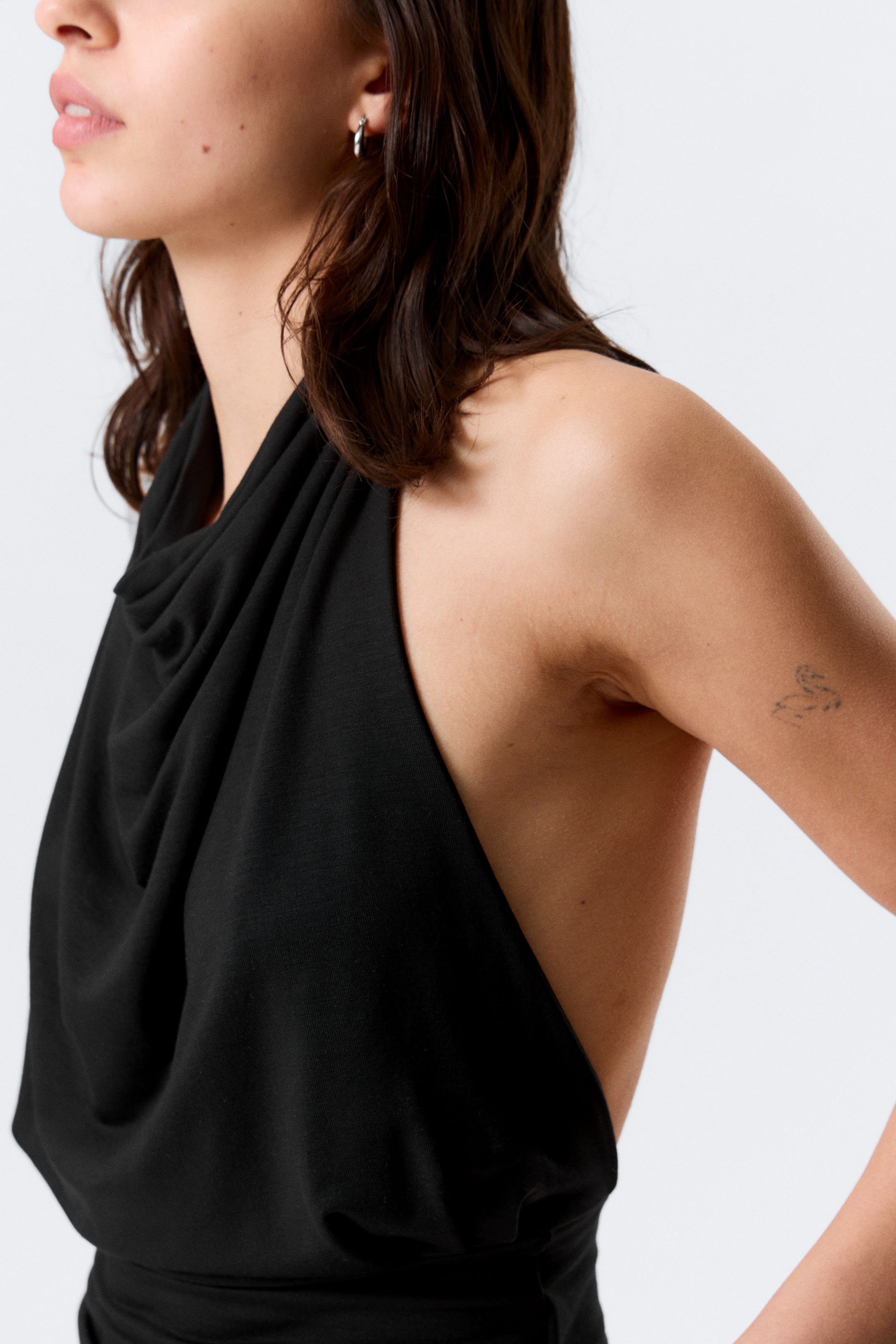 En halterneck-topp laget av myk single jersey med et flytende fall. Designet med en drapert hals som gir en myk, rynket front og åpen rygg. Avsluttes med en bred nedre panel som gir subtil struktur til silhuetten.