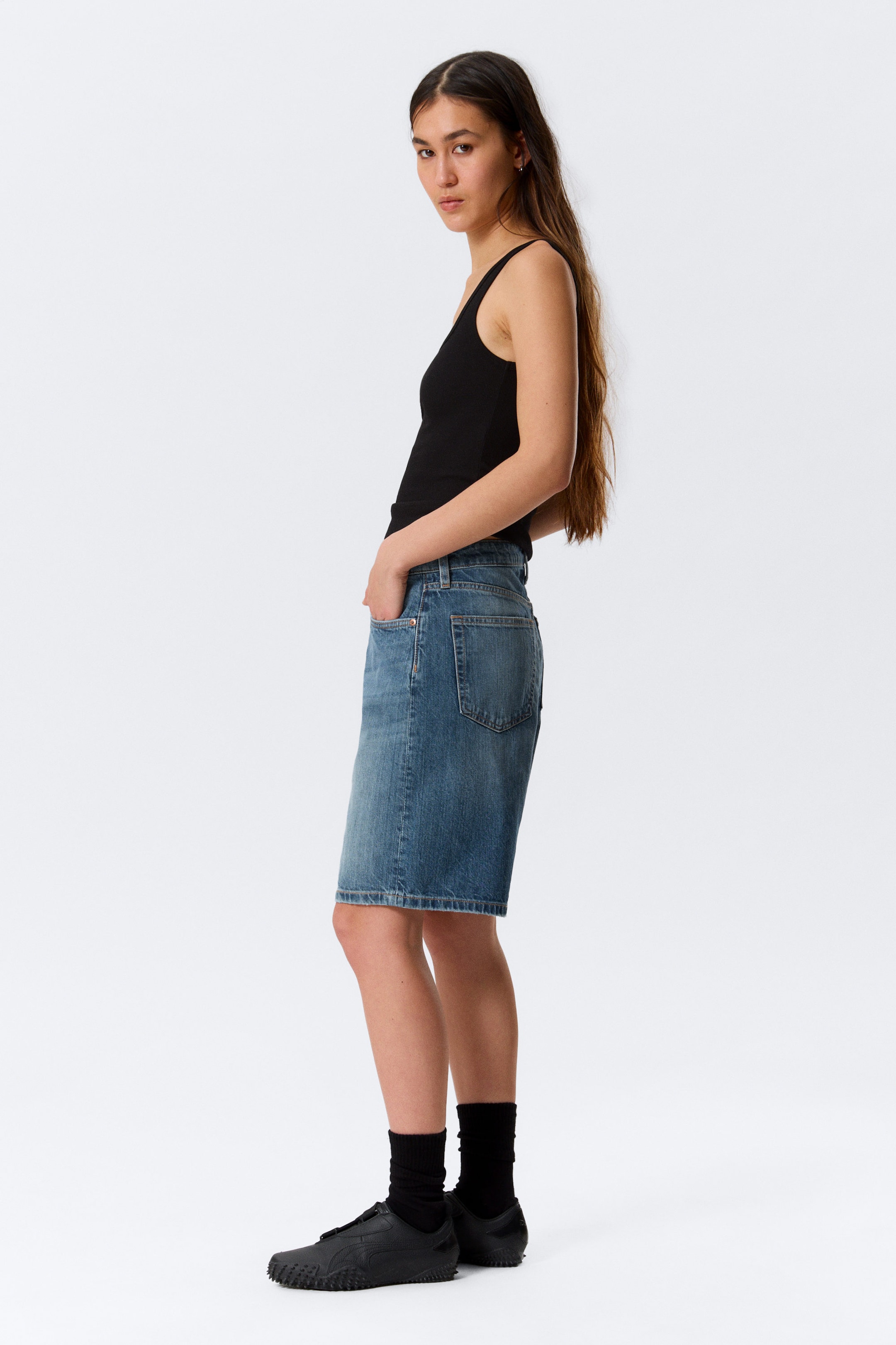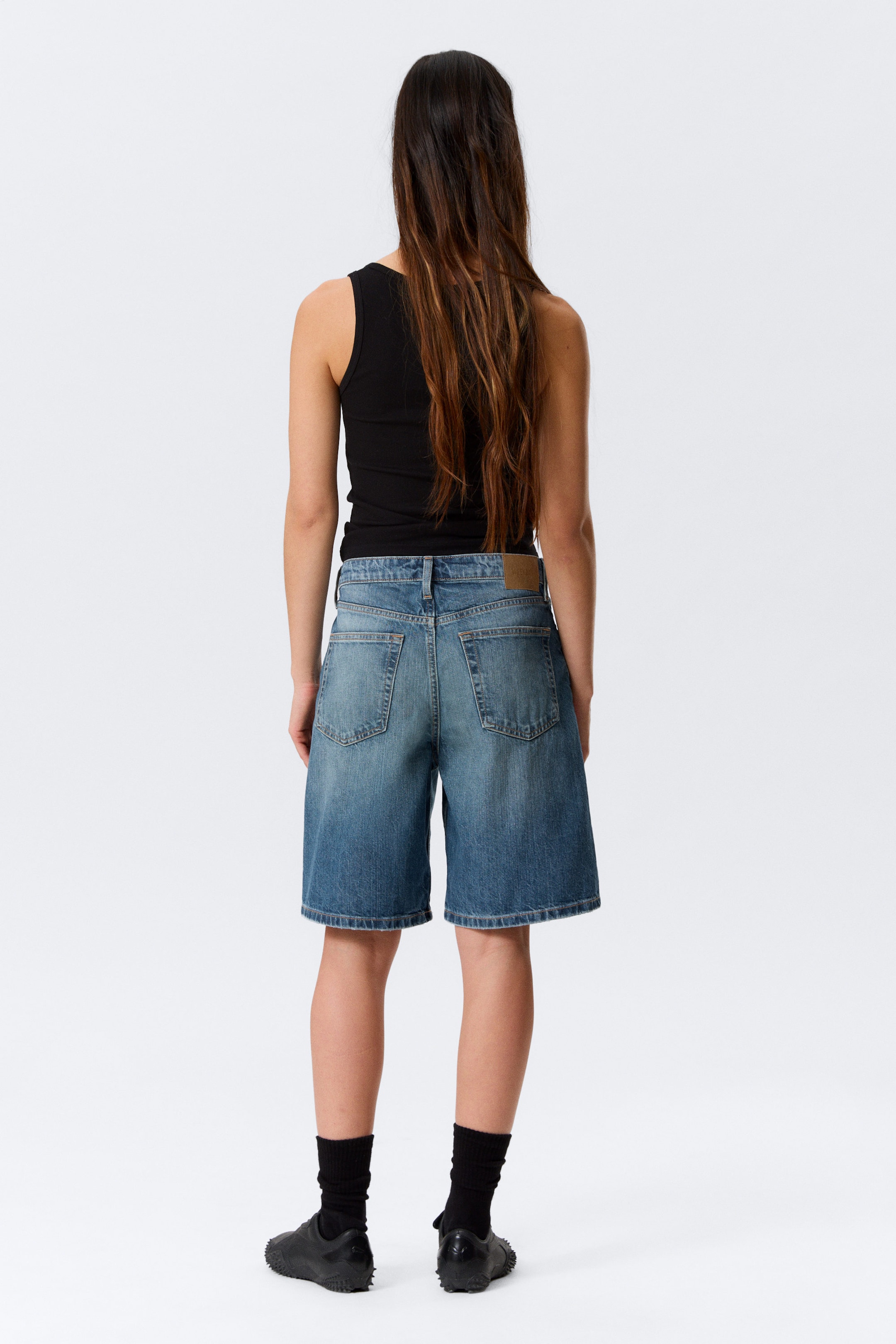 Løse, knelang, lavt liv denimshorts laget av stiv denim i organisk bomull med resirkulert bomull. Klassisk femlommersdesign og oppbrettede falder.