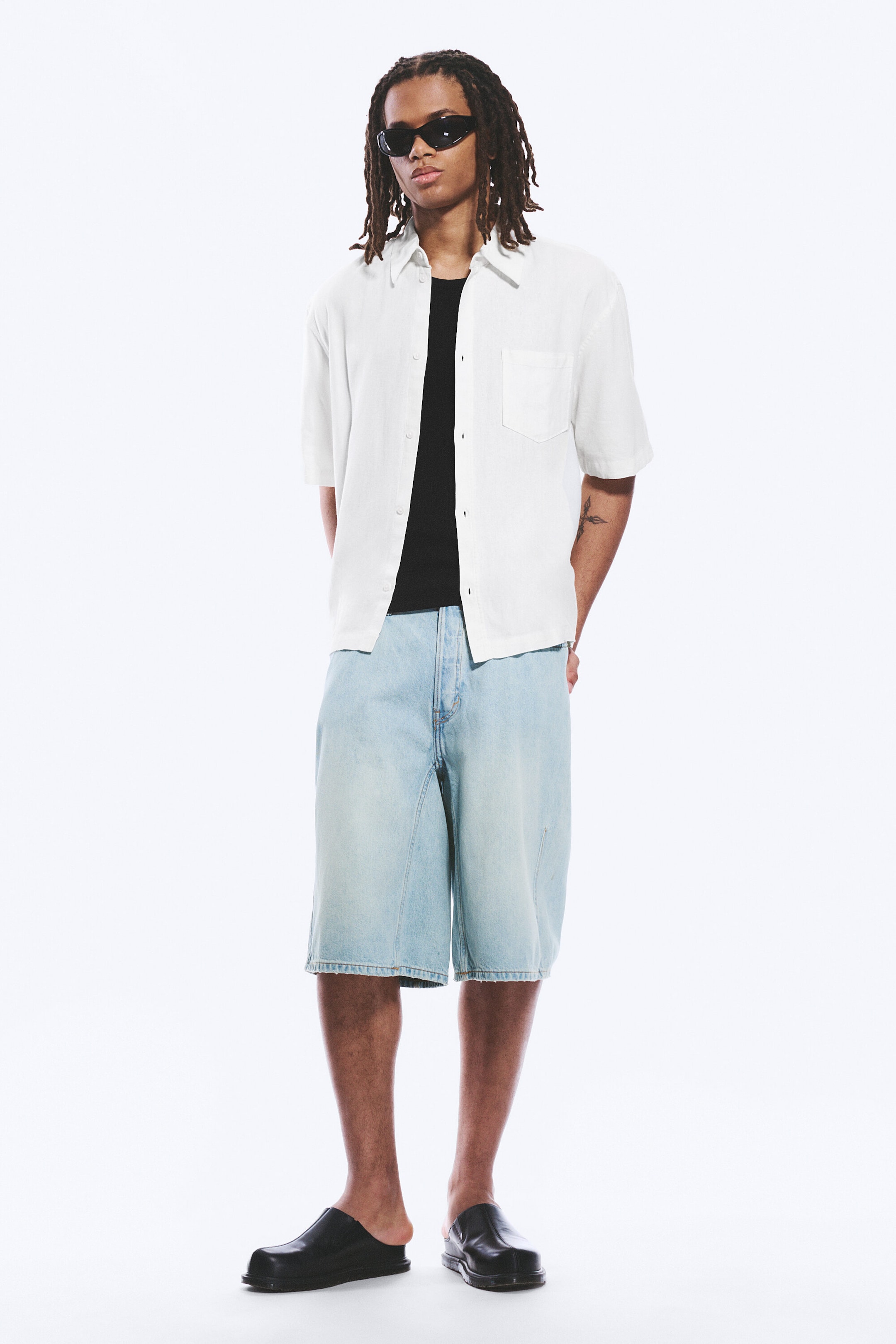 En avslappet kortermet skjorte med knapper, rett fald og en litt boksete silhuett. Laget av en lett linblanding for en pustende følelse, med spiss krage, enkelt brystlomme og knappelukking foran. Perfekt for lag-på-lag eller alene på varmere dager.