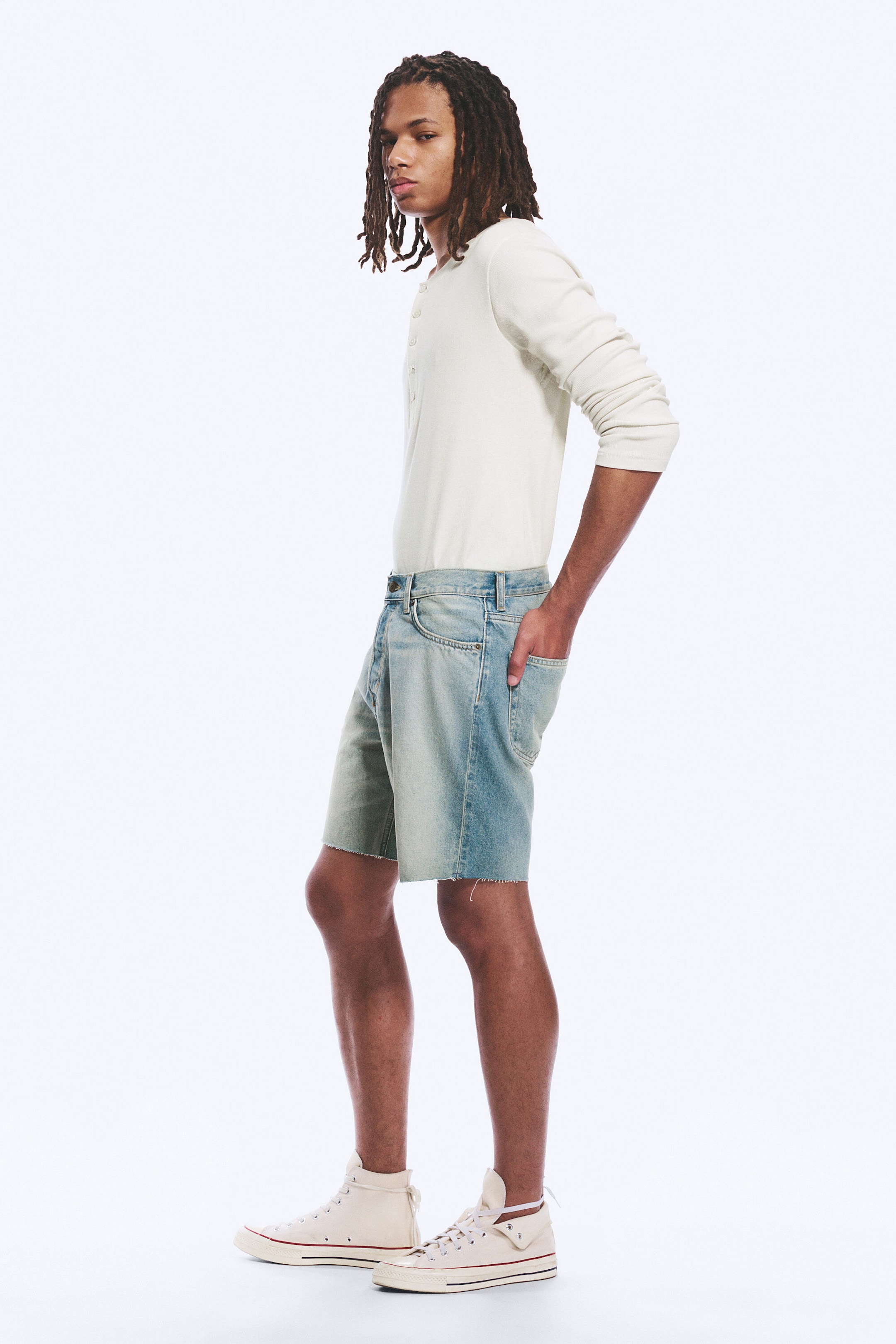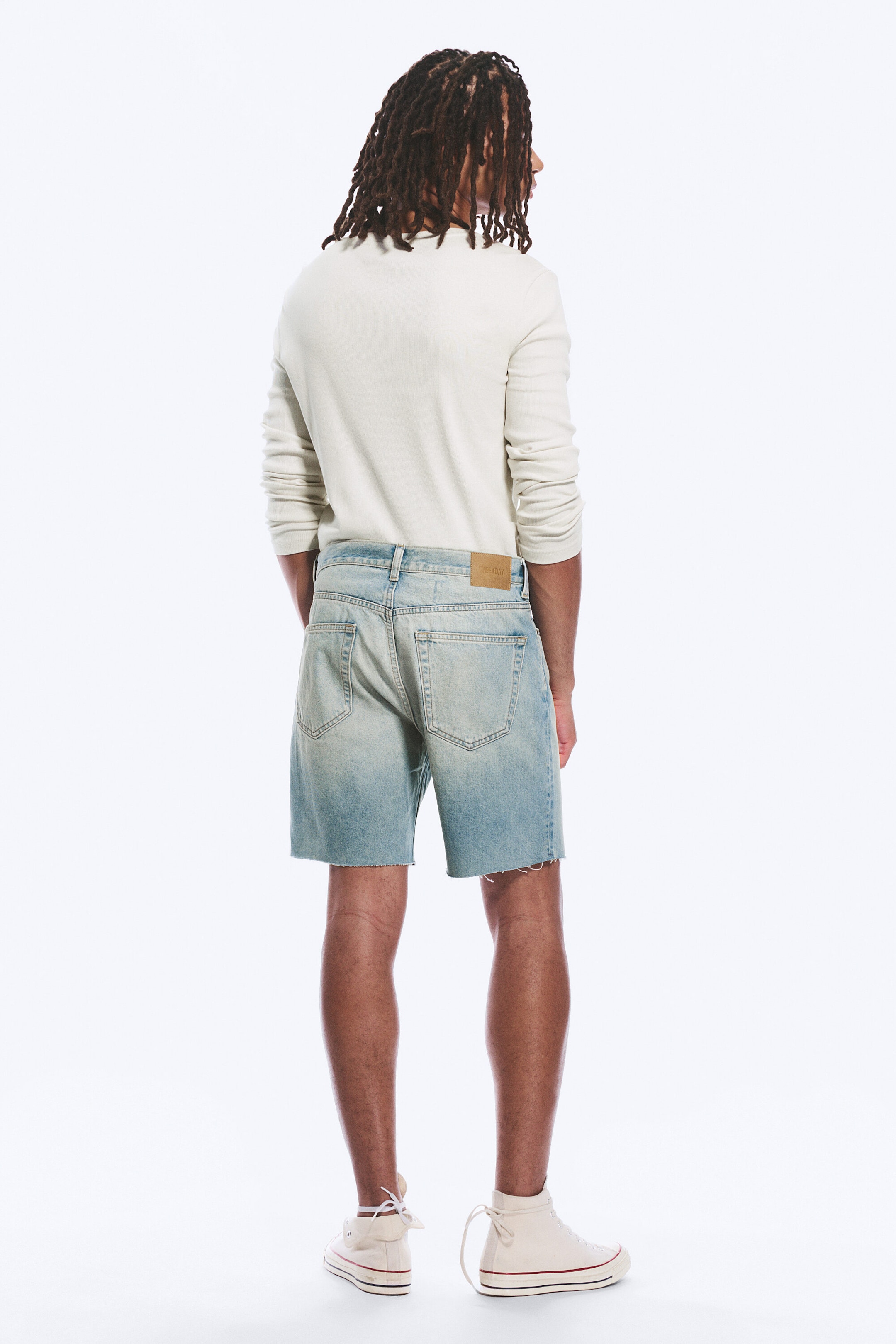 Et par semi-avslappede denimshorts med middels lengde, laget av stiv denim i organisk bomull med resirkulert bomull. Klassisk femlommersdesign og knappelukking. Lys blå vask med rå kantdetaljer.