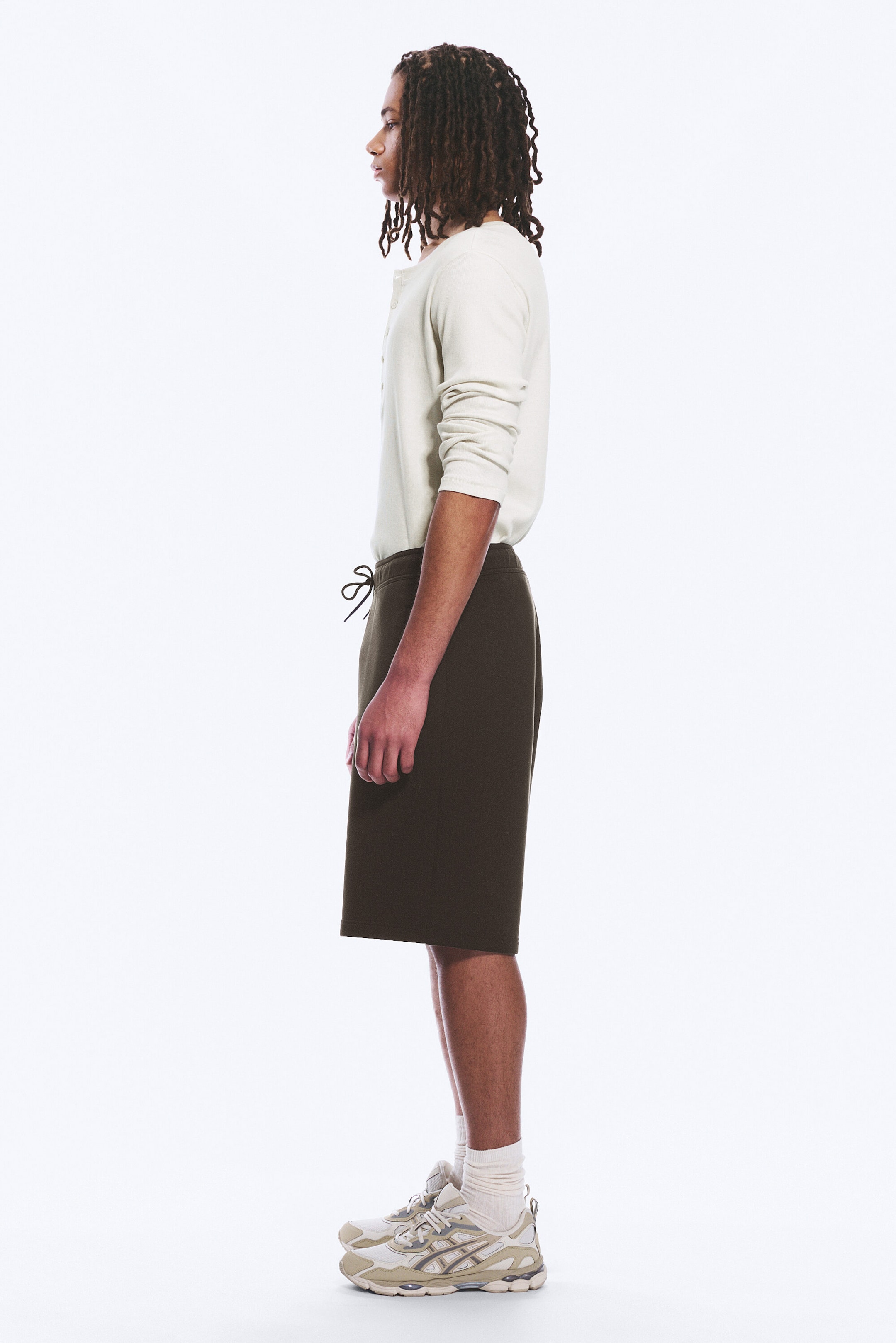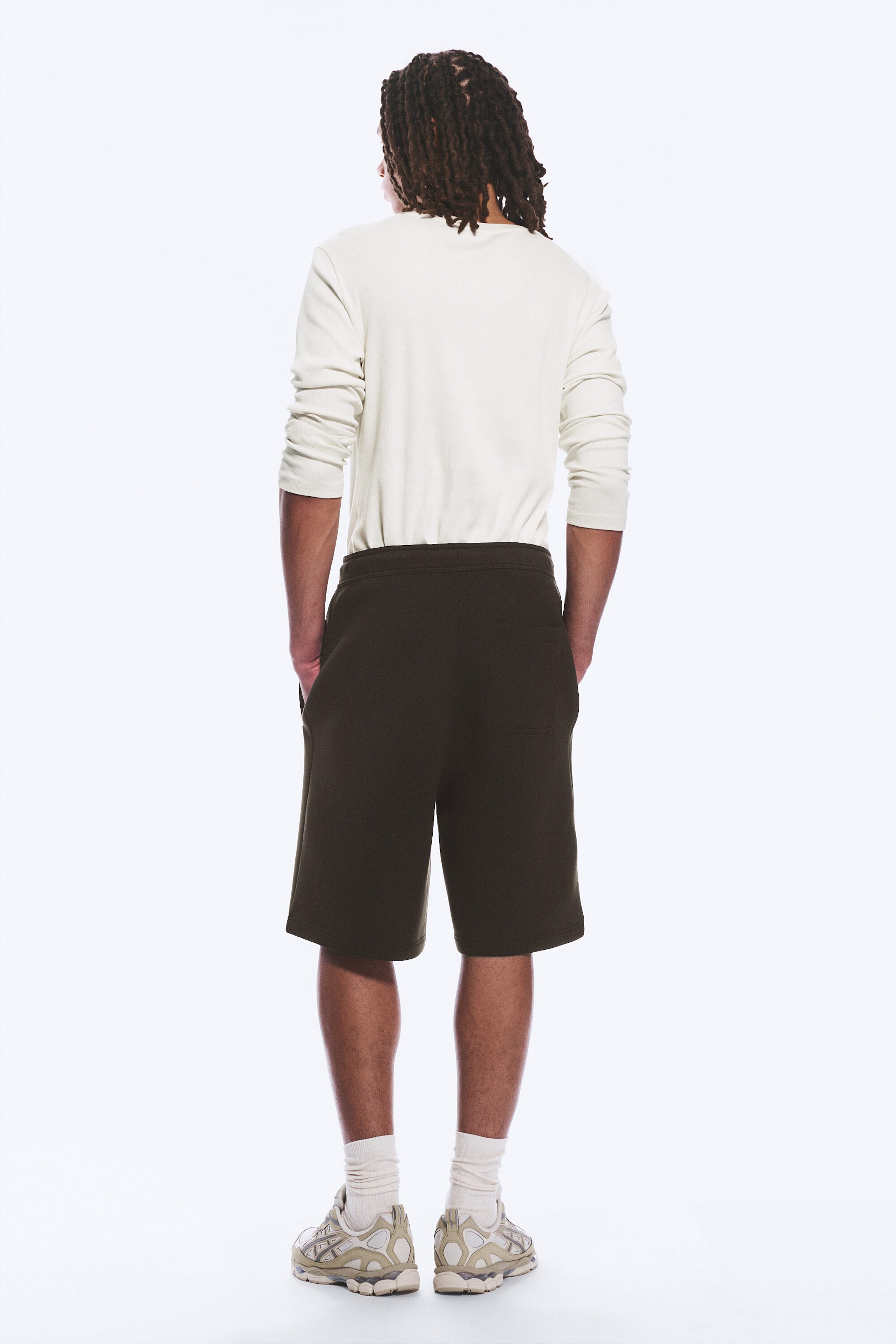 Et par strukturerte knelang shorts med løs passform. Laget av tykk scuba-stoff, har shortsen elastisk snøring i midjen, skrå lommer og en påsydd lomme bak.