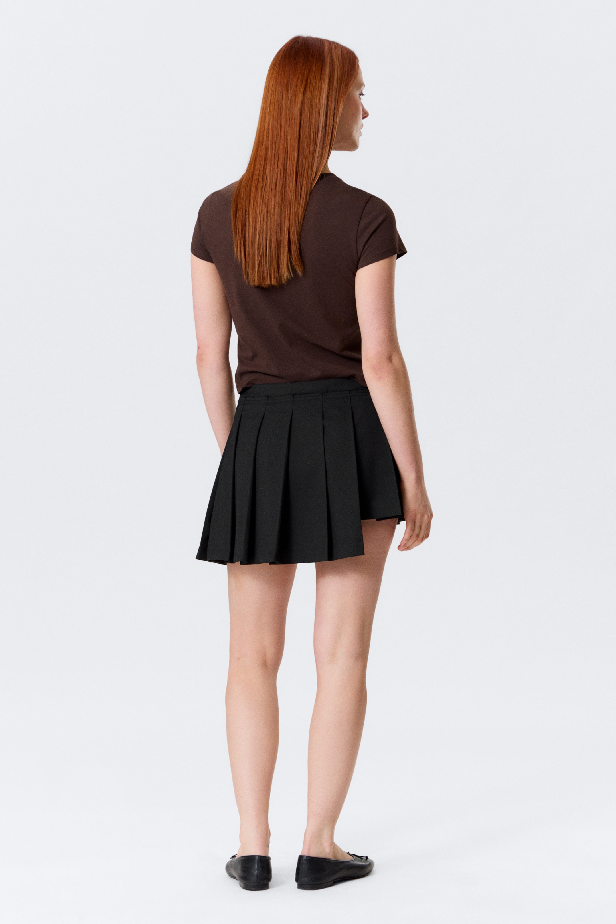 Et kort omslagsskjørt med skarpe folder, laget av dress-twill. Har et asymmetrisk lagdelt frontparti, glatt mid-waist linning og funksjonell omslag med innvendig knepping for justerbar passform.