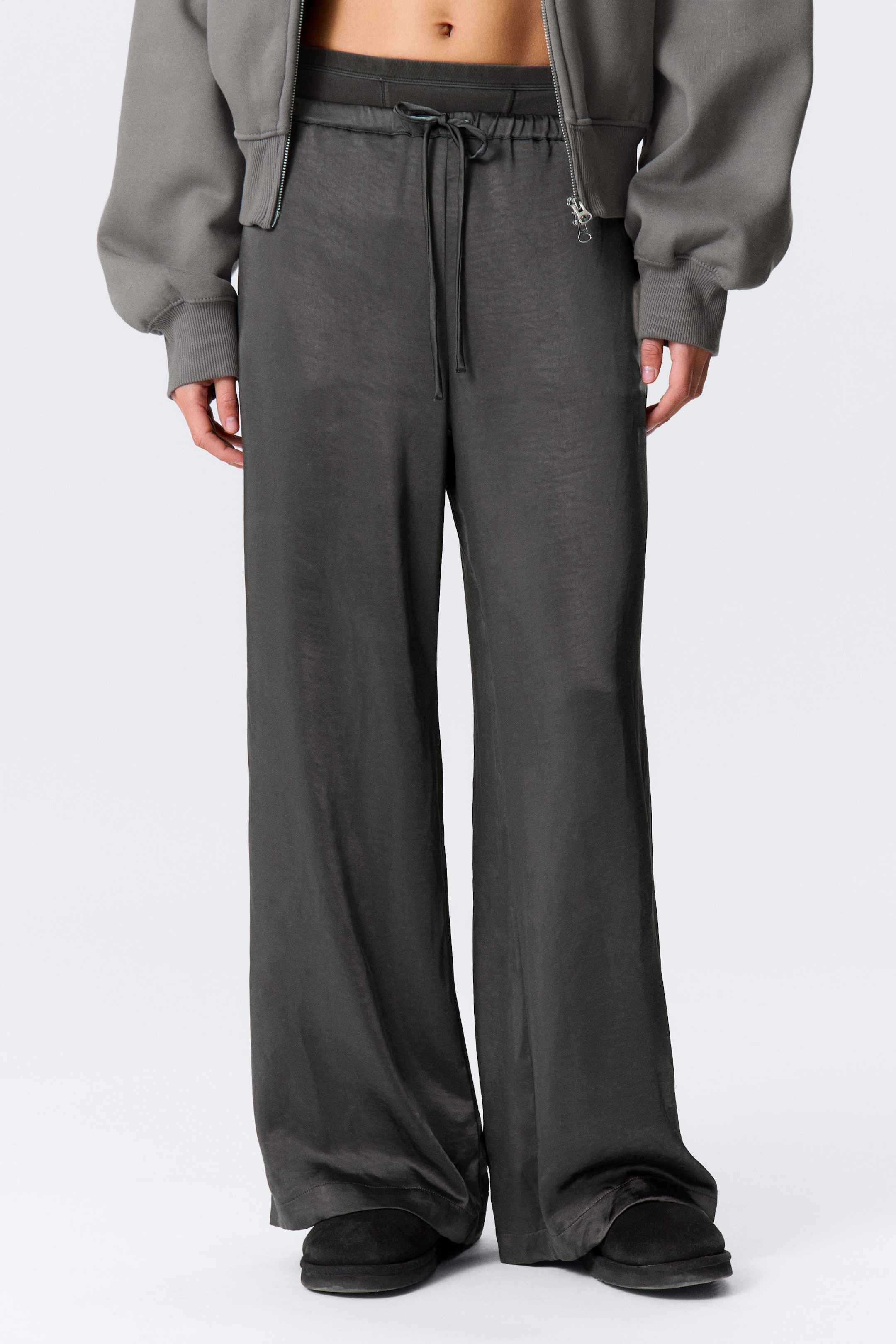 Sidelommer. Elastisk linning med snor. Vide ben. Mykt, vasket satengstoff.
