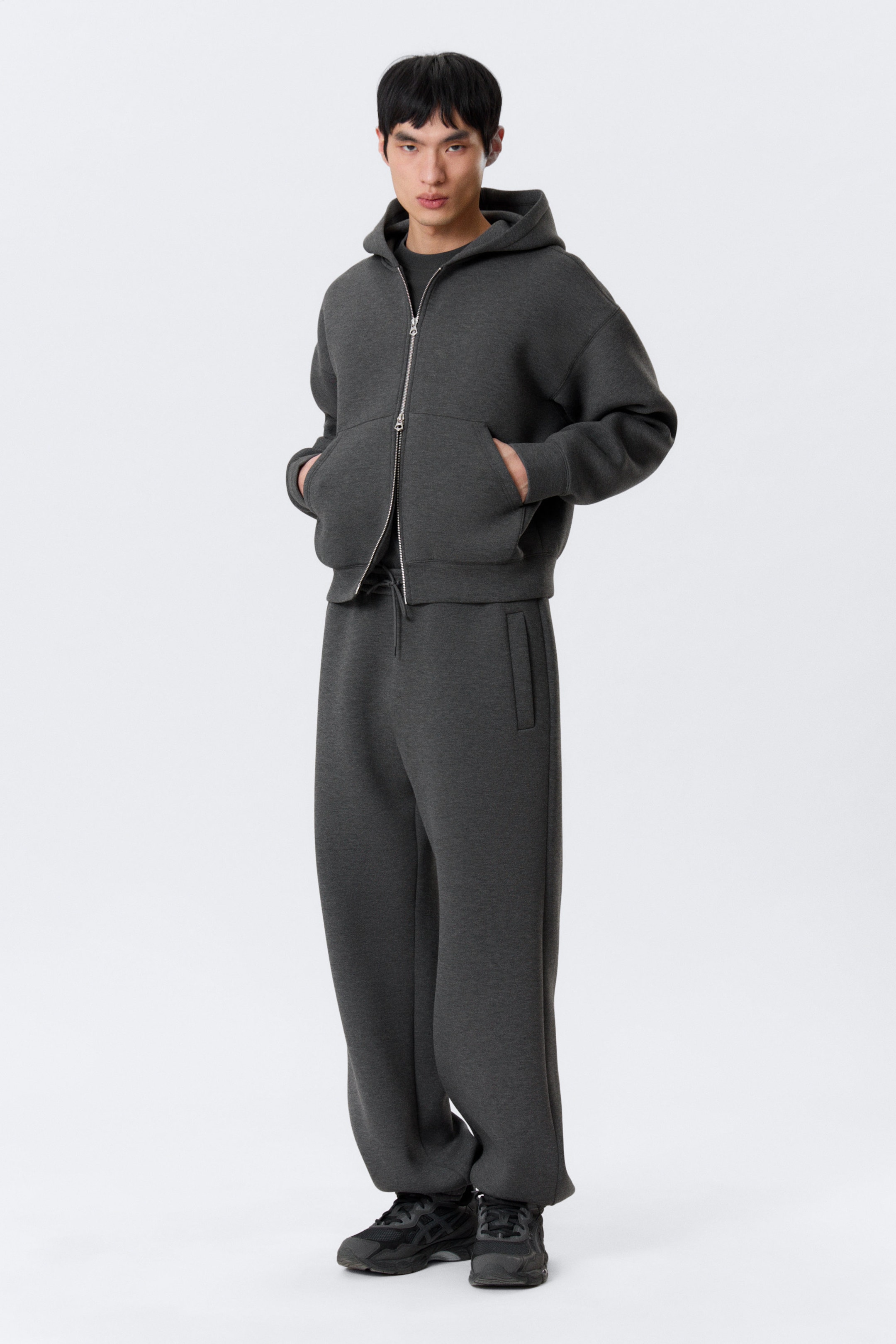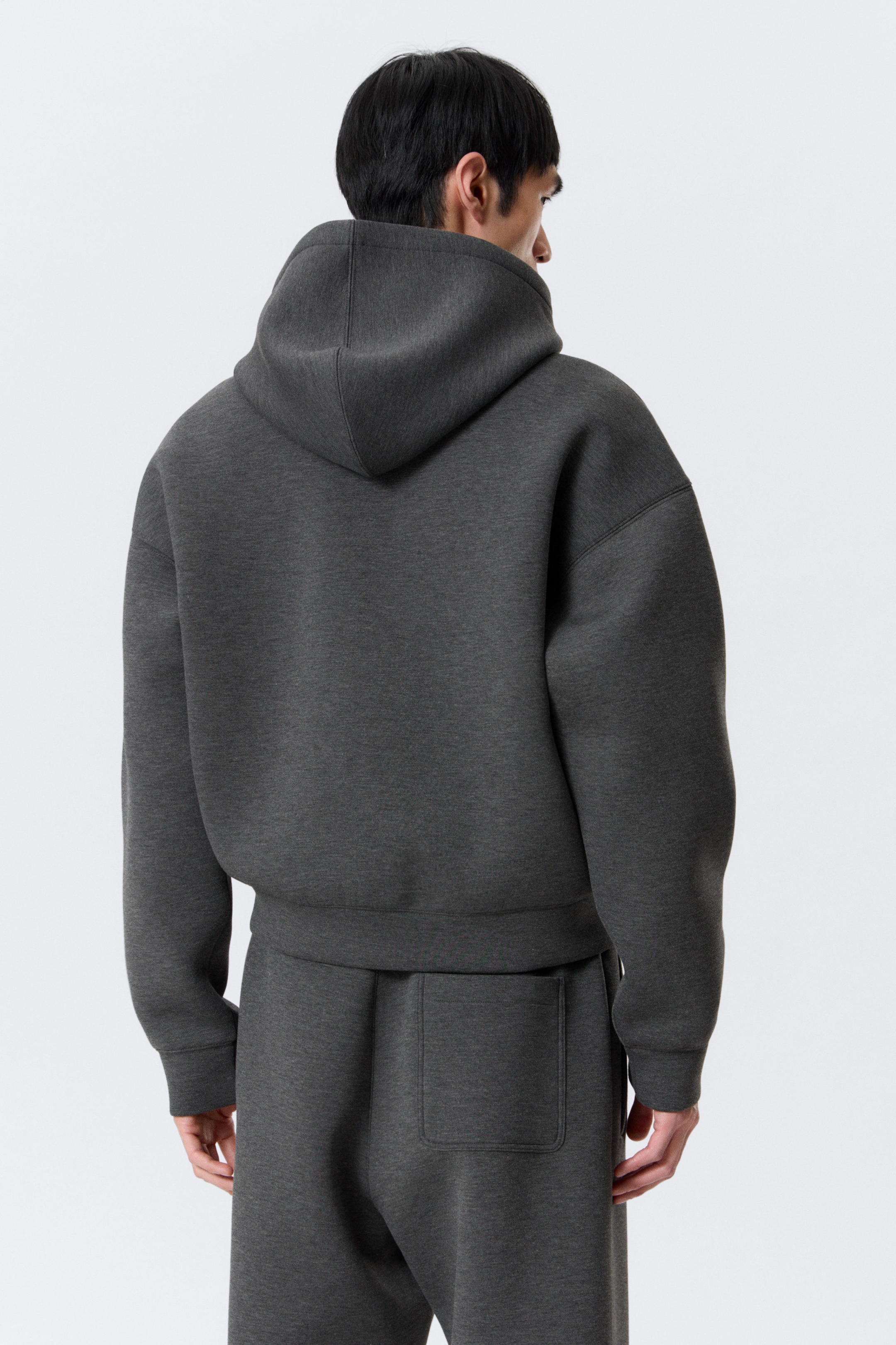 En hettegenser med glidelås i vanlig passform laget av tykk scuba-stoff med en blanding av resirkulert polyester og viskose, forbedret med litt resirkulert elastan. Har lett droppede skuldre, ribbestrikkede mansjetter og fald, og en solid toveis glidelås foran.