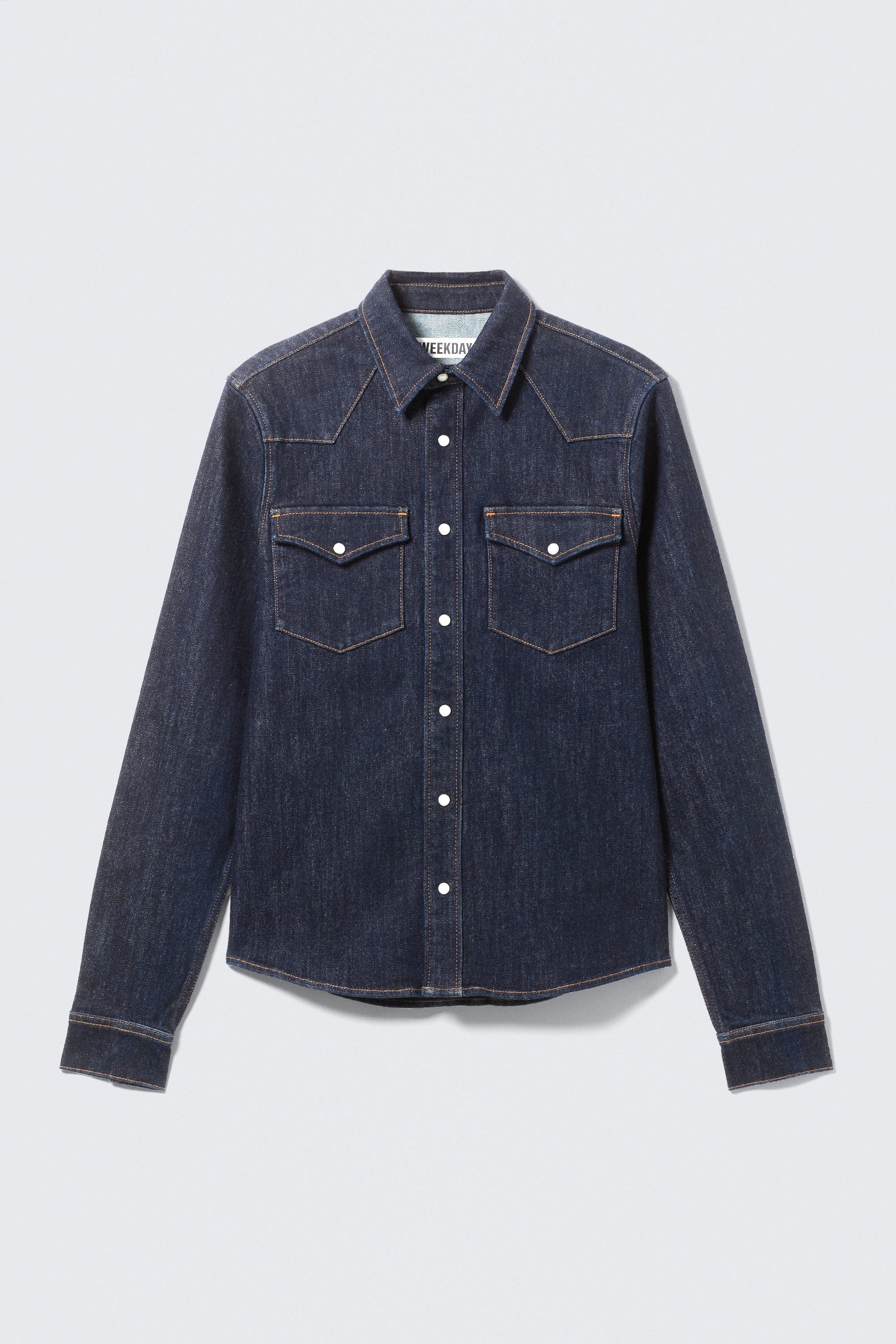 En fasongsydd dongeriskjorte laget av økologisk bomull med komfortstretch og resirkulert bomull. Skjorten har klassisk krage, brystlommer med klaff, buet fald, trykknapper foran og på mansjettene. Designet for en smal passform i mørkeblå vask.